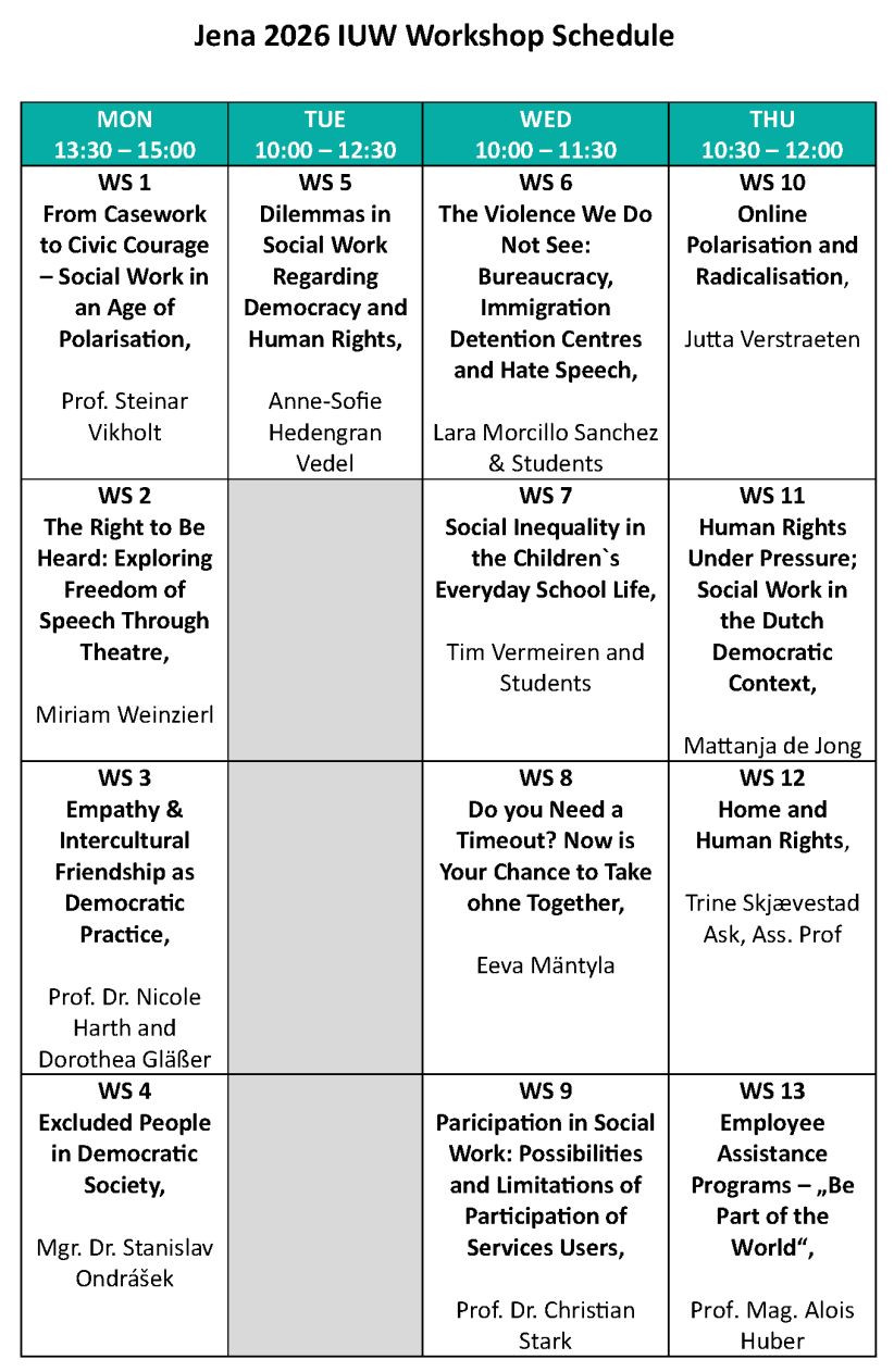 We look forward to the wide range of workshops on our theme of ‘Democracy and Human Rights’ in social work: Description of the workshops
